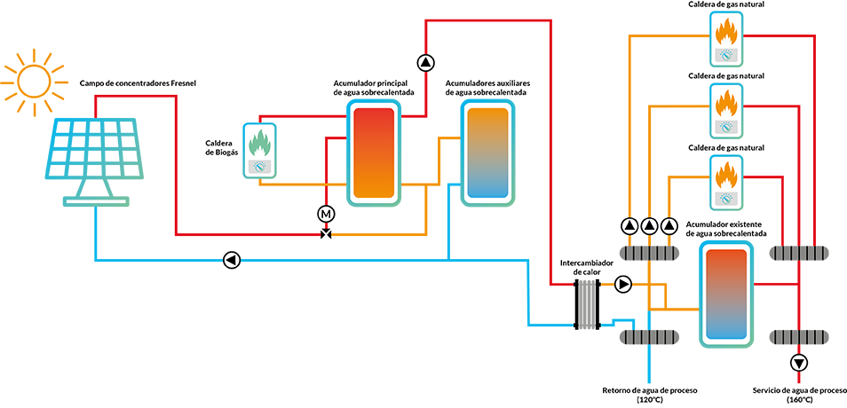 Diseñamos las grandes instalaciones de media temperatura con un sistema de acumulación para optimizar la integración de la producción de energía solar térmica con la curva de demanda del cliente. Tanto la adecuada selección de tecnología de paneles, del tamaño del campo y del volumen de acumulación son las principales herramientas que utilizamos para ofrecer a nuestros clientes la solución que mejor se adapta sus necesidades tanto a nivel técnico como a nivel económico.